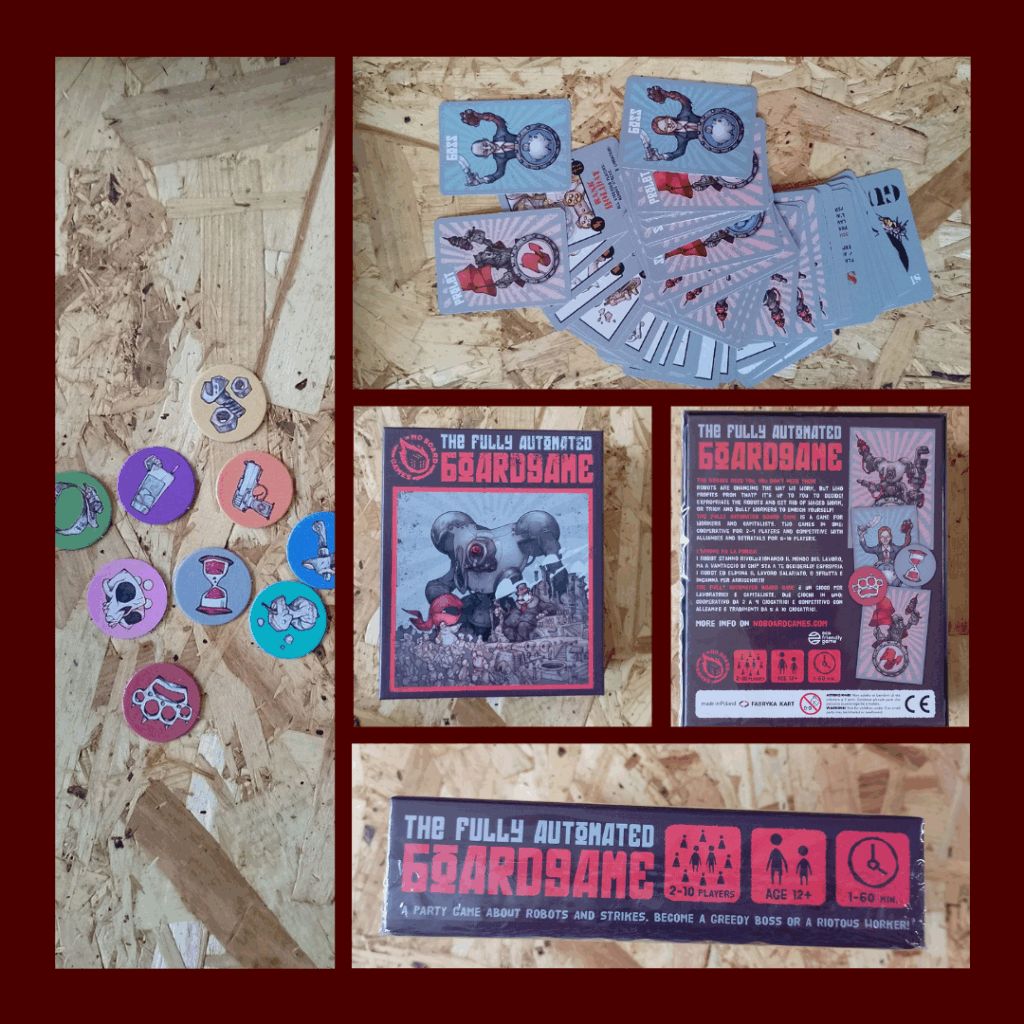 The Fully Automated Board Game is a fast party game based on robots, unionism, and achieving full automation. The game is for 2 to 10 players and features elements of diplomacy, bluffing, and a pinch of Luddism.